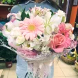 Уменьшенный: роза розовая - 3 шт., гербера розовая - 2 шт., лилия белая - 1 шт., эустома белая - 1 шт., альстромерия белая - 2 шт., фетр розовый, крафт, лента розовая. Примерный размер: 20Х20 см.
