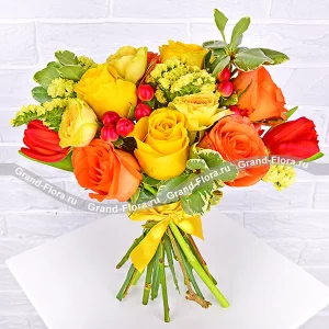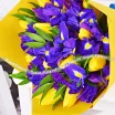 Стандартный: тюльпан желтый - 6 шт., ирис синий- 5 шт., статица, упаковка, лента.